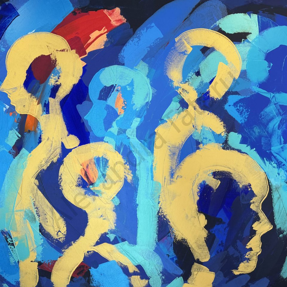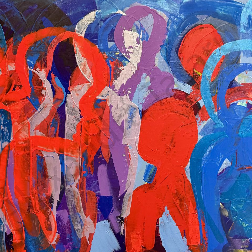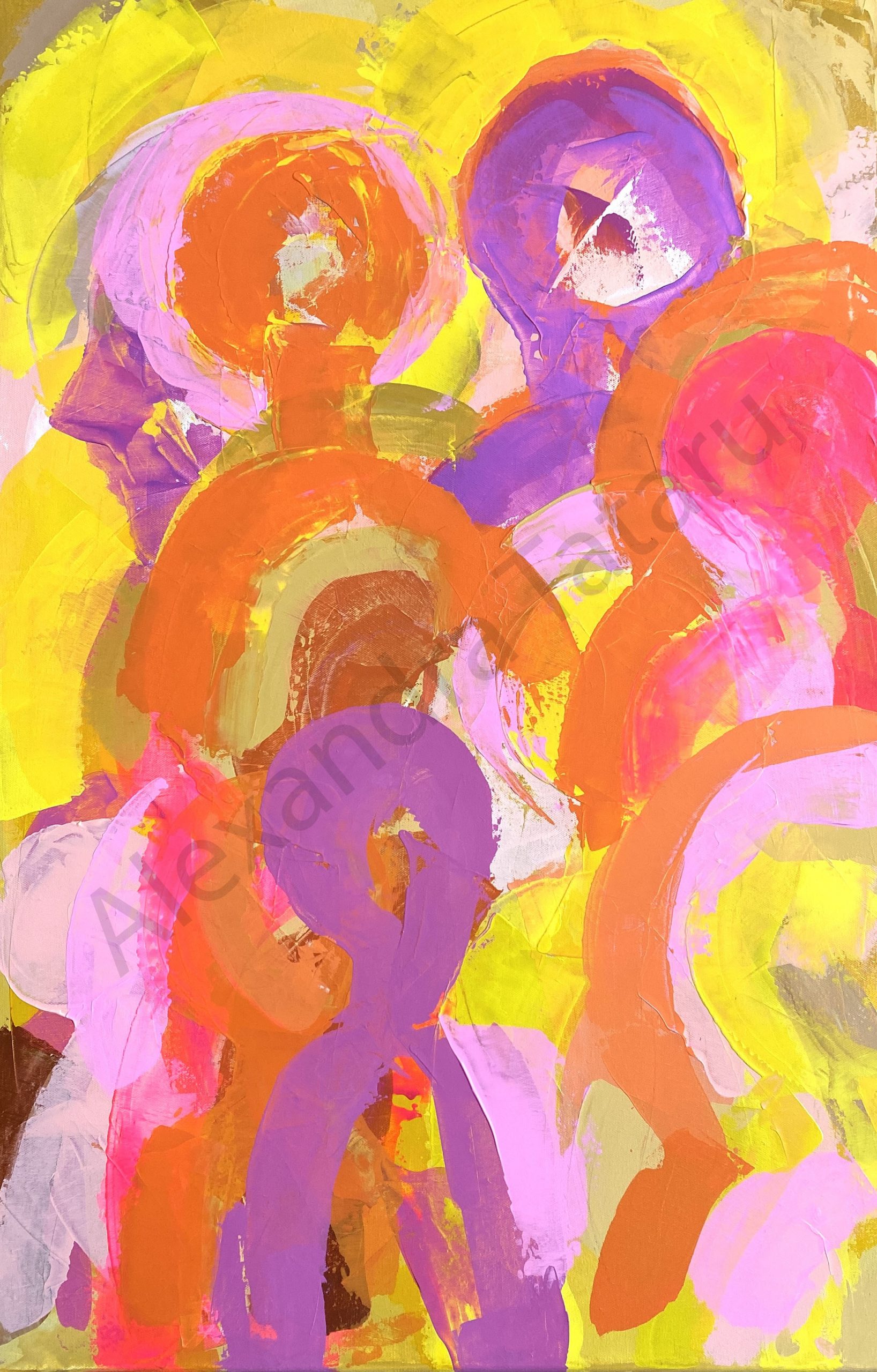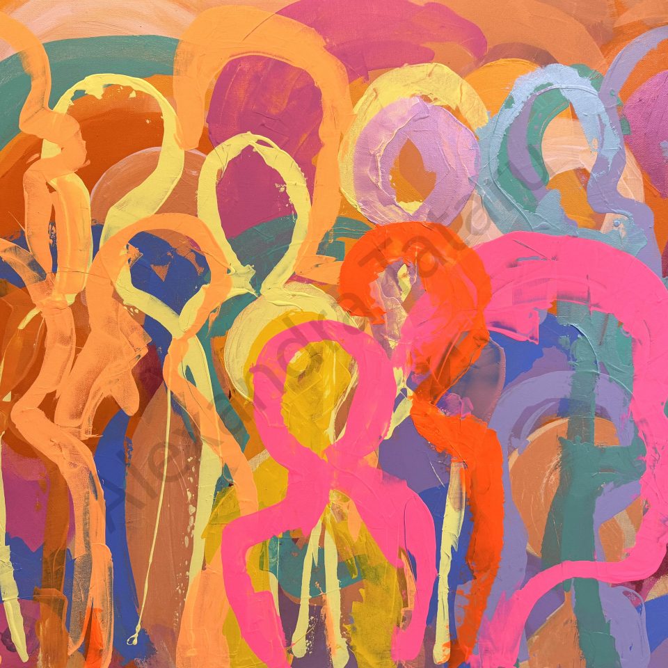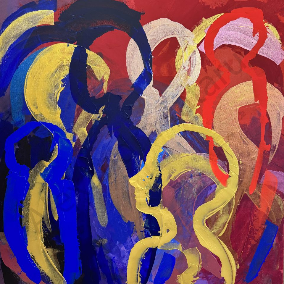 Crowds is the precursor to the Ethnic Synergies collection, which is one of the reasons I wanted to exhibit it alongside Ethnic Synergies. Crowds is a reflection of what I perceive when a gathering of individuals from various origins, ethnicities, and cultural heritages comes together, by design or by happenstance, to connect, enjoy, and mingle, or simply to move about amidst each other. The colours I’ve chosen depict the energy and motion they emit. Our energies are a reflection of our lives, and while we are all different, we are all, ultimately, similar. We may hold different beliefs, but in the end, we are all part of a crowd, each day constructing our own societies’ distinct traits, never as a mirror image of someone else and always unique in our essence. And because some have particularly stood out from the crowd at various times in history, the dance of their personalities has helped to create our world today. Alexandra Tataru