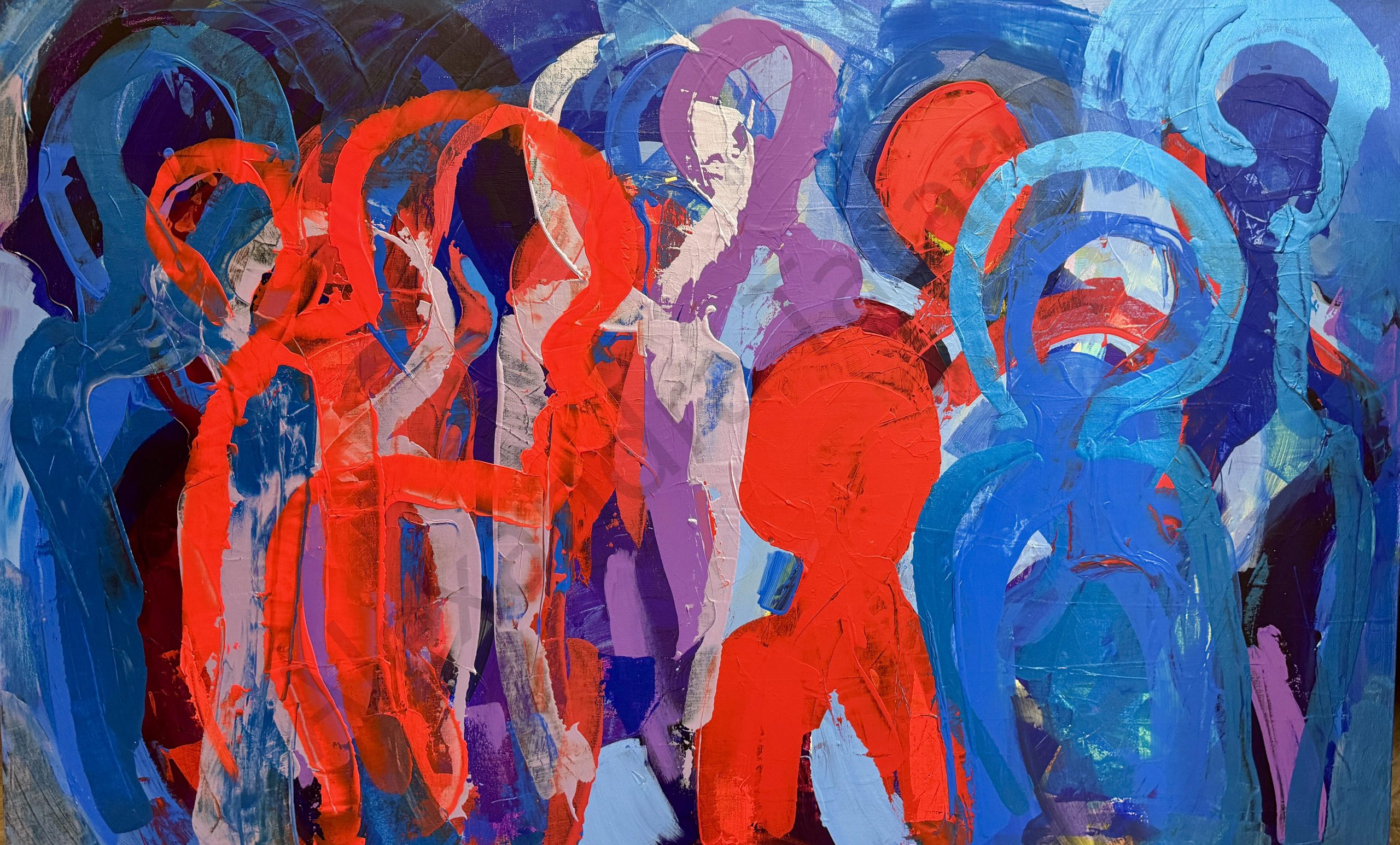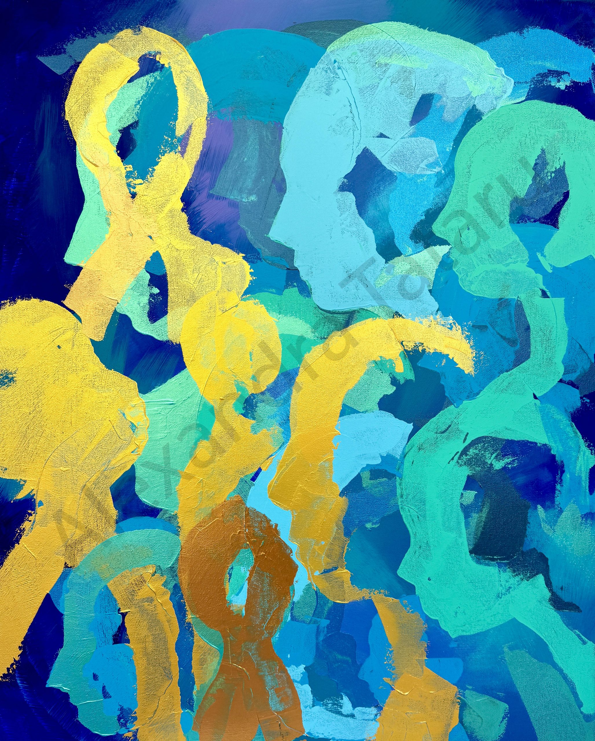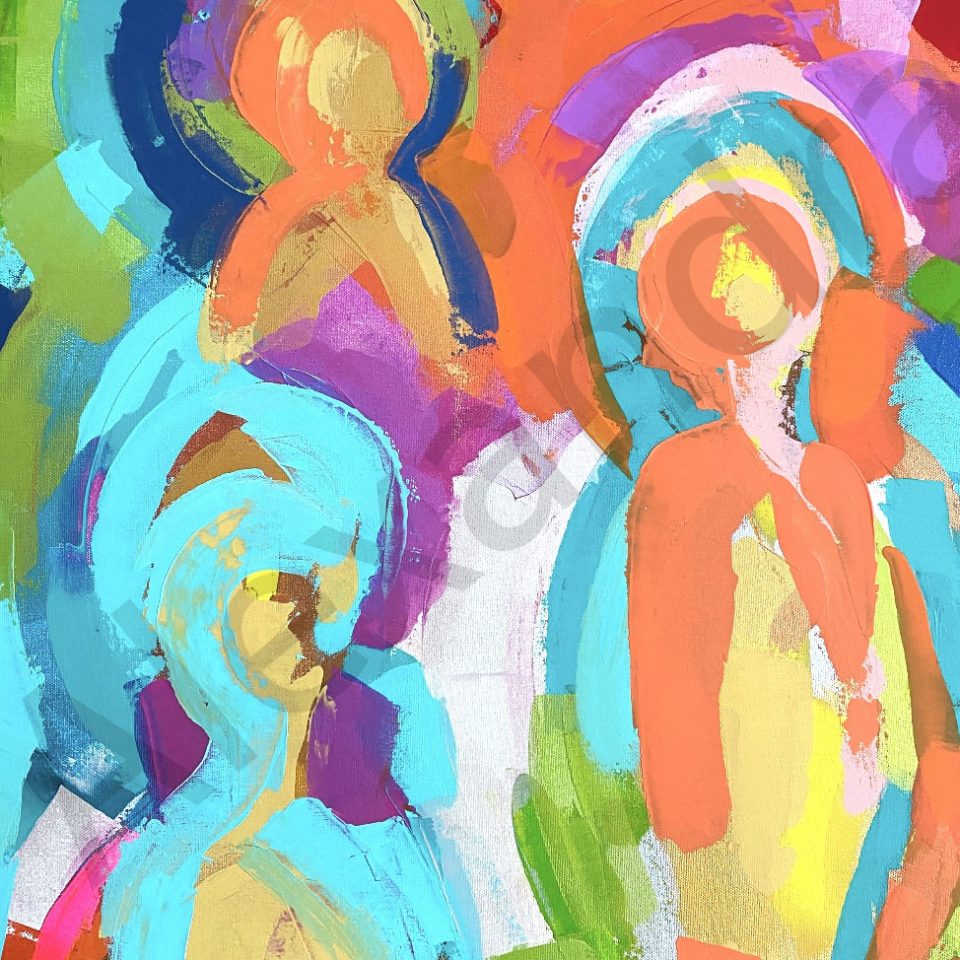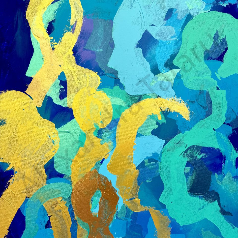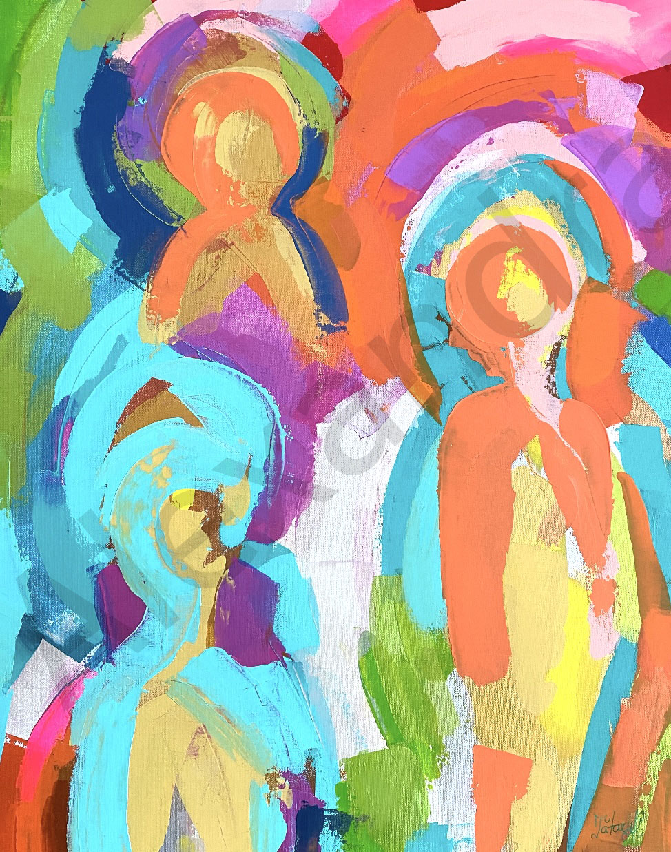 Crowds is the precursor to the Ethnic Synergies collection, which is one of the reasons I wanted to exhibit it alongside Ethnic Synergies. Crowds is a reflection of what I perceive when a gathering of individuals from various origins, ethnicities, and cultural heritages comes together, by design or by happenstance, to connect, enjoy, and mingle, or simply to move about amidst each other. The colours I’ve chosen depict the energy and motion they emit. Our energies are a reflection of our lives, and while we are all different, we are all, ultimately, similar. We may hold different beliefs, but in the end, we are all part of a crowd, each day constructing our own societies’ distinct traits, never as a mirror image of someone else and always unique in our essence. And because some have particularly stood out from the crowd at various times in history, the dance of their personalities has helped to create our world today. Alexandra Tataru